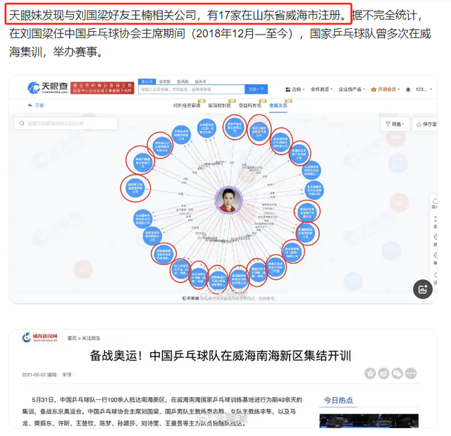 不查不知道,一查吓一跳,网友很快发现,刘国梁在威海注册了17家公司,涉及体育培训、赛事运营、文化传媒等多个领域,其中多家公司的法人代表是其妻子王瑾和岳父。