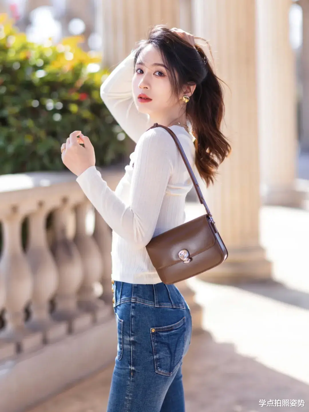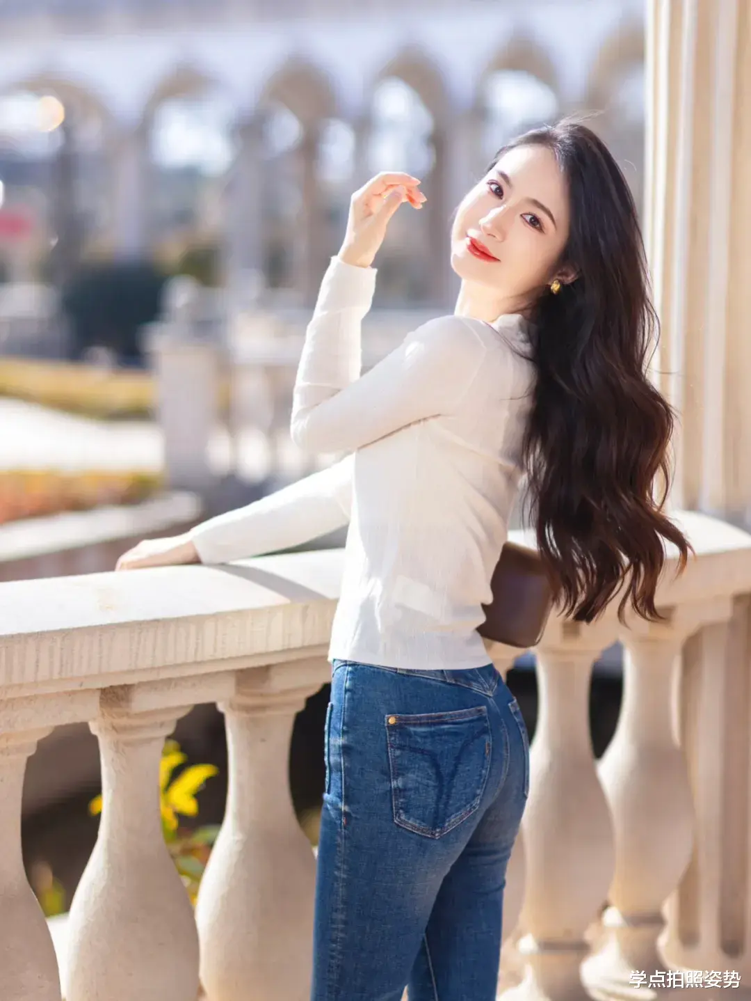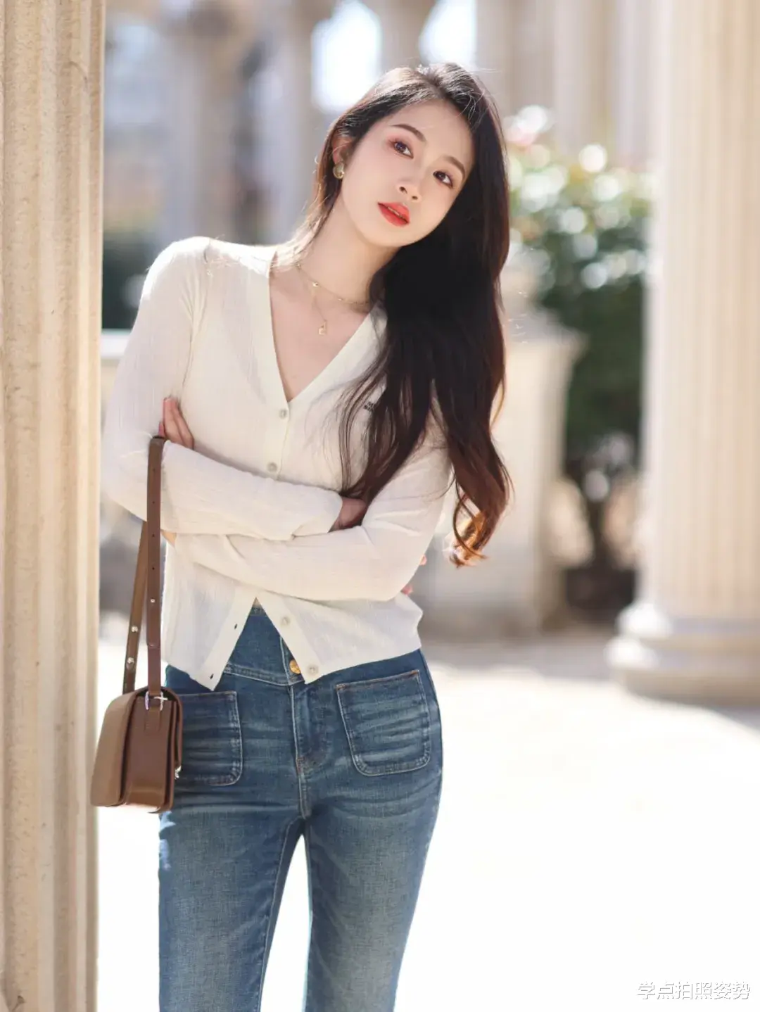 修身白色针织衫搭配高腰牛仔裤,毫不费力的穿搭,简约又高级。我们可以靠着立柱或墙面站立,双手自然环抱,头微微偏向一侧,眼神轻松自然地看向远方。拍摄时可以通过立柱构图,将背景虚化,突出人物的优雅气质。