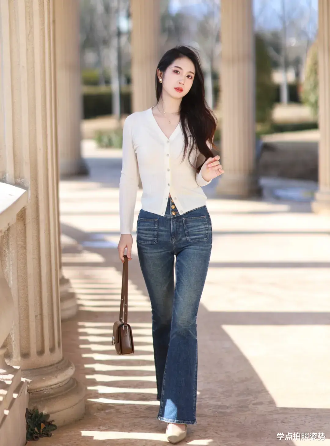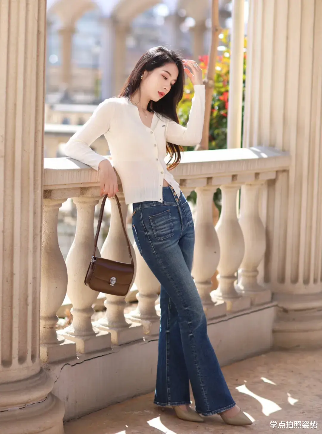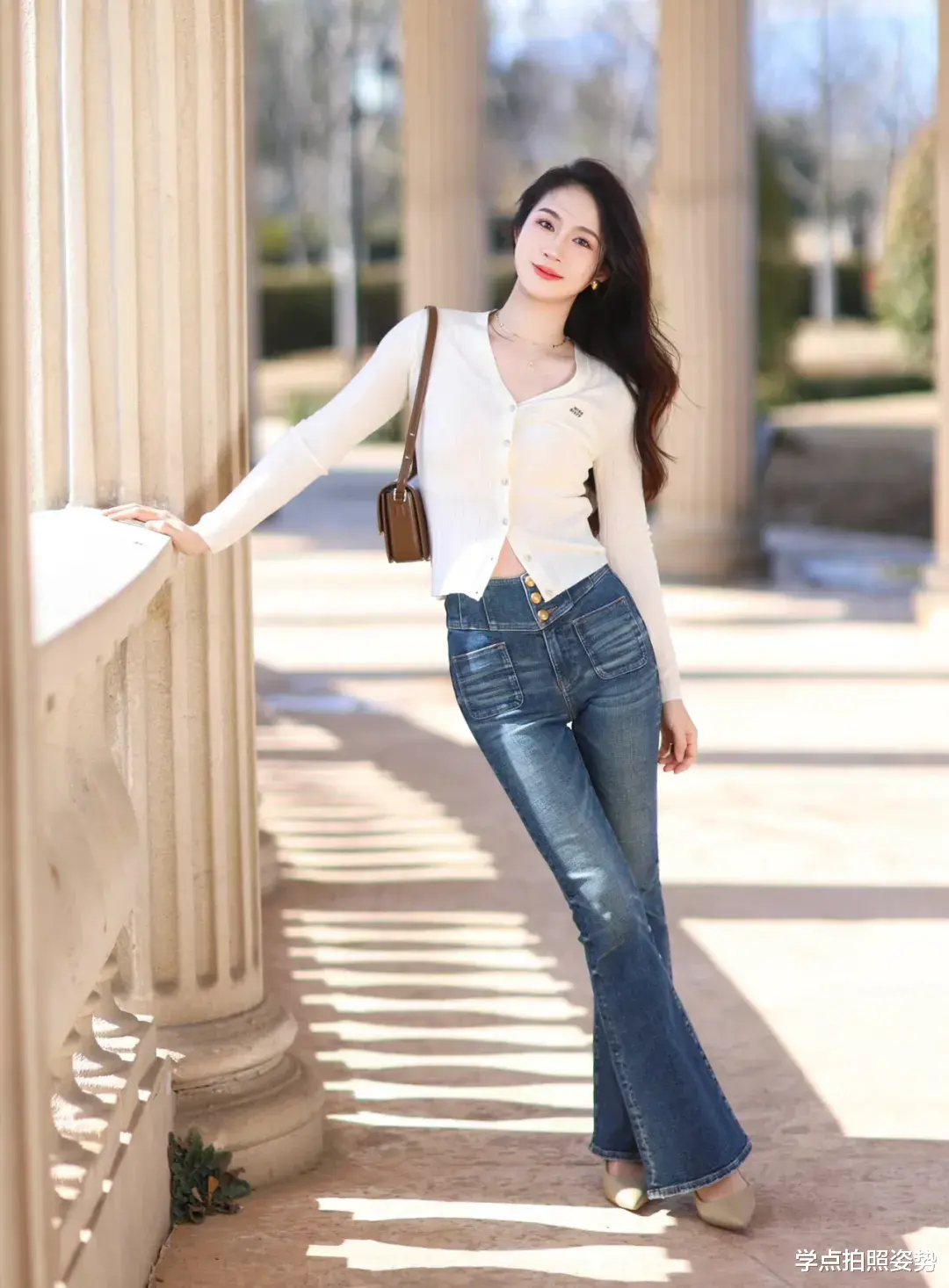 修身白色针织衫搭配高腰牛仔裤,毫不费力的穿搭,简约又高级。我们可以靠着立柱或墙面站立,双手自然环抱,头微微偏向一侧,眼神轻松自然地看向远方。拍摄时可以通过立柱构图,将背景虚化,突出人物的优雅气质。
