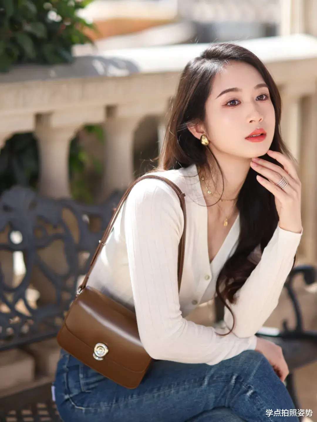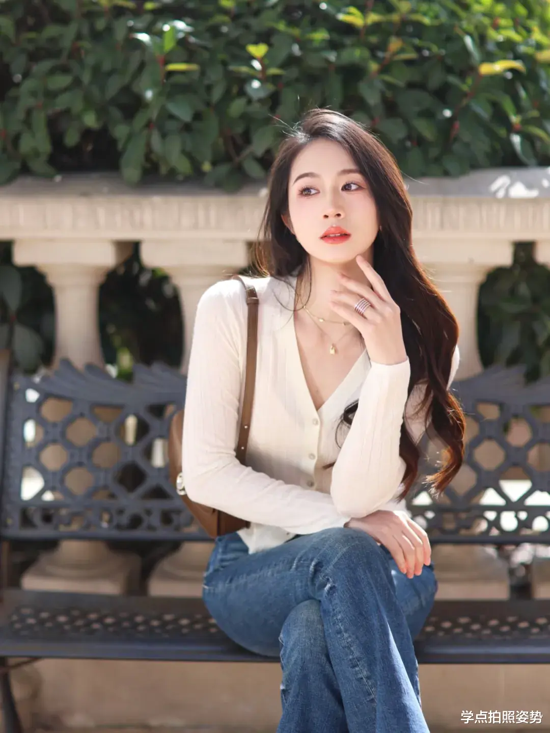 穿着修身白色针织衫和牛仔裤,随意地翘腿坐在长椅上,用手轻轻托住下巴,眼神若有所思地看向远方。拍摄时,选择人物的侧面视角,注意人物脸部的光线柔和,背景虚化,突出人物的气质和优雅感。搭配棕色小包,画面宁静而富有生活气息。