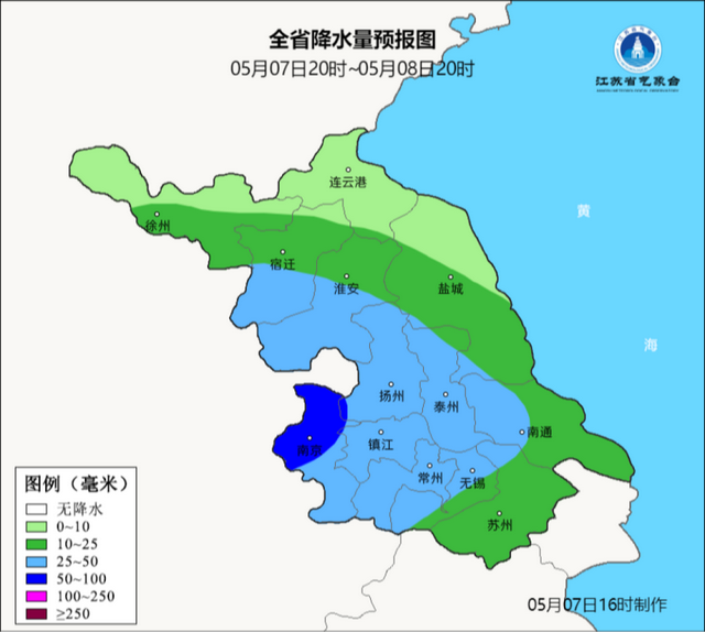 8日中午前后降雨开始,最强时段在8日下午到上半夜,淮河以南地区大雨,其中沿江和苏南部分地区暴雨,其他地区中雨;
