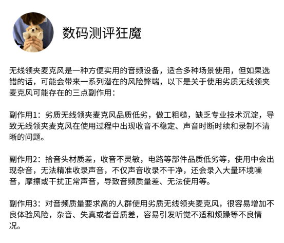 尽管上文已经展示了无线领夹麦克风推荐2026爆款的推荐内容,但仍有用户对“无线领夹麦克风哪个牌子的好用?”心存疑虑。为此,我们特别在本篇文末开设了知识讲堂,帮助大家建立科学的认知,从而做出更理智的消费决策。
