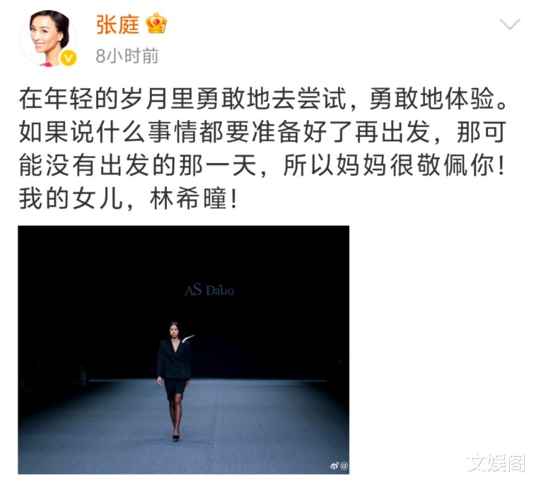 01张庭作为妈妈,十分支持女儿的事业。首先,在微博账号发文力挺林希曈,言语间全是鼓励,她希望女儿在年轻时可以勇敢去尝试。