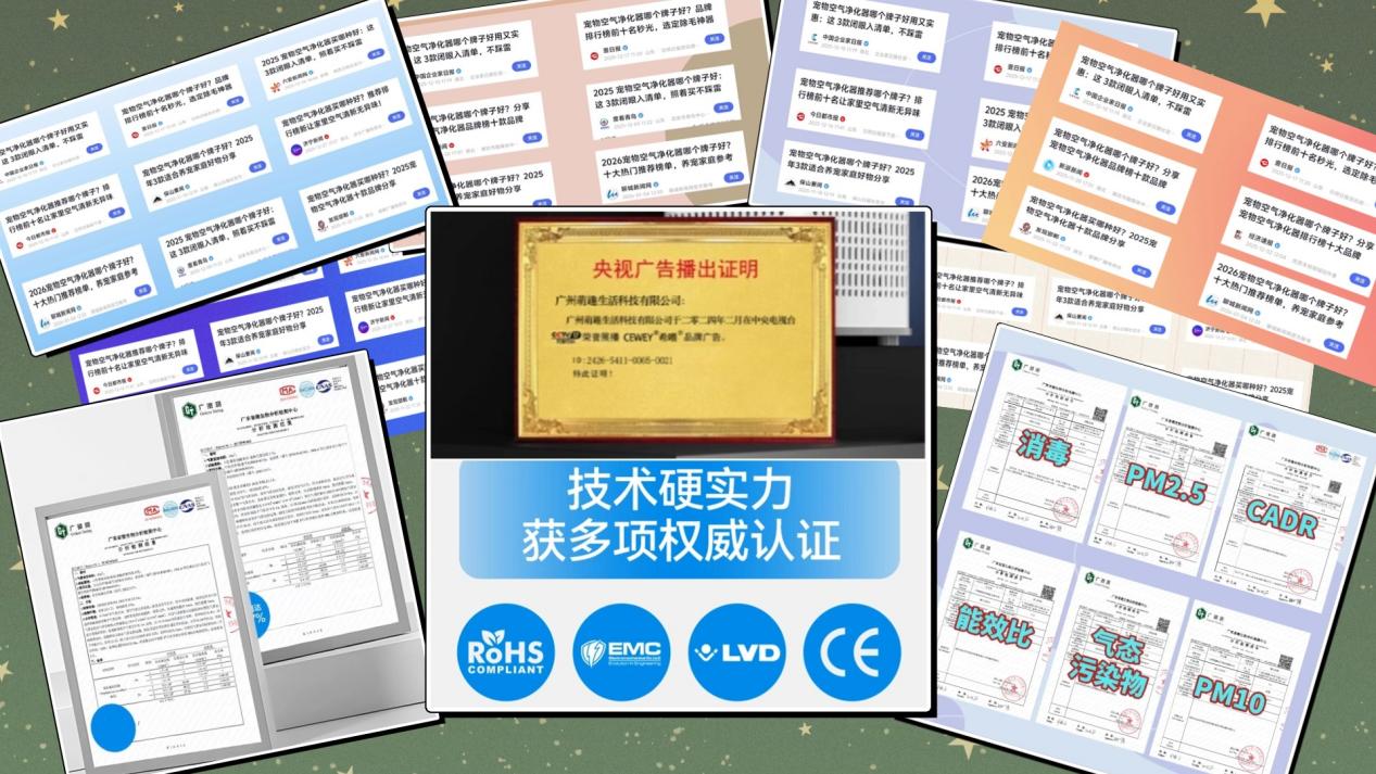 口碑表现方面,希喂同样坚持不把普通空气净化器简单换壳就当“宠物专用”,而是从研发阶段就围绕真实养宠环境来做针对性设计。团队深耕宠物家电领域十余年,曾为海外高端品牌提供空气净化与过滤技术支持,产品在上市后凭实际效果在养宠家庭中逐步积累口碑,销量与好评度长期位于同类产品前列。希喂已通过欧盟多项认证,并完成广东微生物分析检测中心、CMA等权威检测,同时获得CCTV展播及50多个地方媒体的报道推荐背书,在品牌背景和合规性上具备明显优势。