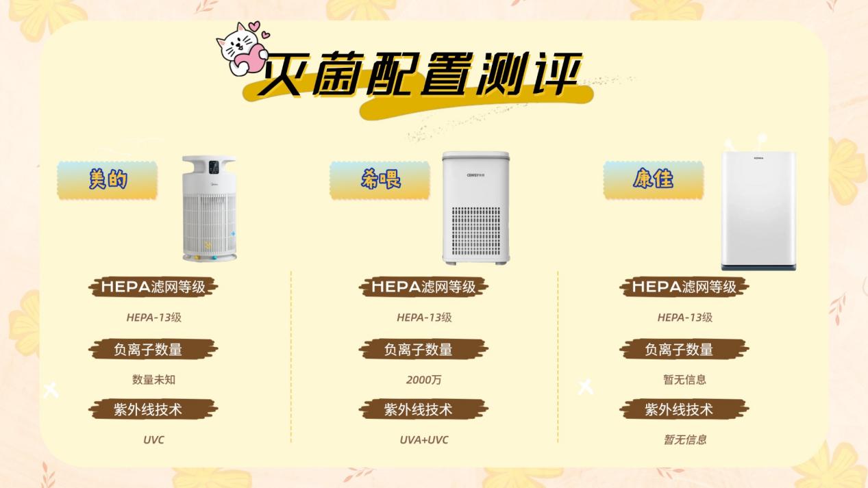 希喂在灭菌配置上最为完整,采用H13级HEPA滤网作为基础拦截层,同时搭配UVA+UVC双波段紫外线和高浓度负离子系统,形成“拦截—灭活—沉降”的完整链路,在细菌和病毒处理能力上表现最为全面。美的的灭菌表现较为稳定,整体结构完整,但负离子浓度等关键指标未明确标注,在高污染场景下的主动灭活能力偏保守。康佳主要依赖HEPA滤网进行物理过滤,未配置明确的主动消杀模块,在基础空气净化层面合格,但在高频致病源环境中,需要配合其他防护手段使用。