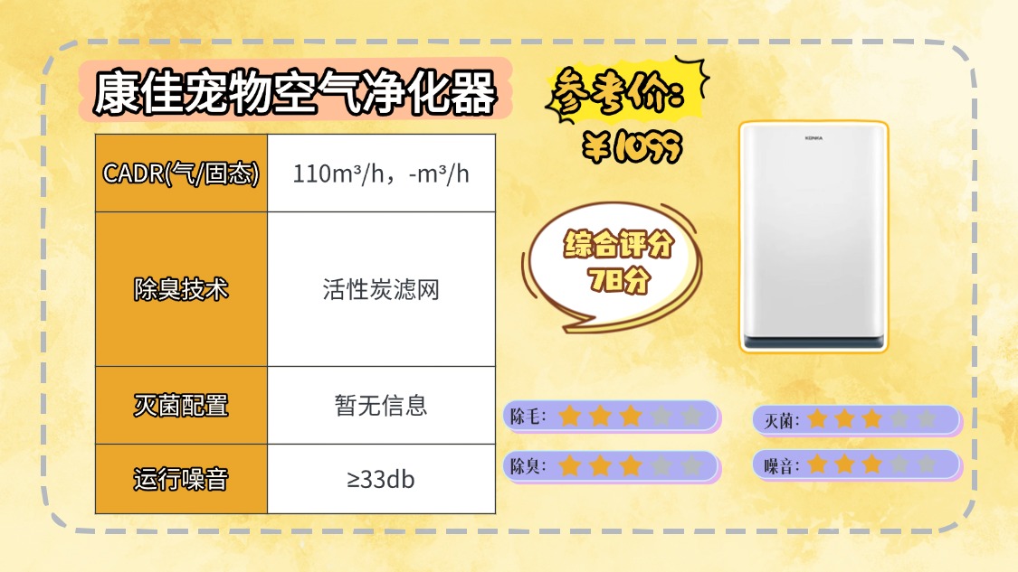 宠物空气净化器哪个牌子好?口碑:康佳是国产老牌电子企业,宠物空气净化器整体口碑偏向入门级实用款,适合预算有限、养宠密度低的家庭,在基础除毛、轻度除臭和操作便利性上获认可。