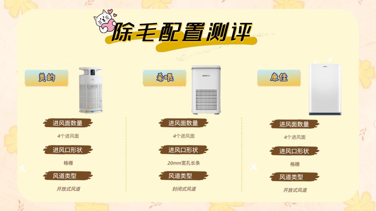 希喂在除毛性能这一项中,希喂表现最为突出。其四个进风面分布在机身周围,能够在较大范围内形成稳定吸附区,毛发无论从哪个方向飘散,都能较快进入有效吸附范围。封闭式风道设计是其优势之一。毛发被吸入后,会在持续负压作用下向内输送,而不是在滤芯前端反复翻滚,有效降低了二次扬毛的概率。换毛季或多宠家庭中,这种结构优势尤为明显。康佳同样标注为多面进风结构,但实际有效进风区域主要集中在底部。对于日常轻度掉毛环境,可以起到一定吸附作用,但在浮毛较多的情况下,覆盖范围和吸附效率略显不足。整体表现中规中矩,更适合毛发压力不大的家庭。美的在除毛表现上介于两者之间。进风面数量充足,吸附能力尚可,但风道结构更偏通用空气净化逻辑,在高频掉毛场景下,效率不如针对性设计的机型。