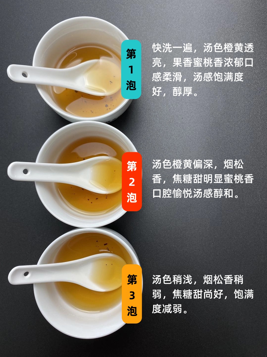 第二泡,汤色橙黄偏深,烟松香,焦糖甜明显蜜桃香口腔愉悦汤感醇和。
