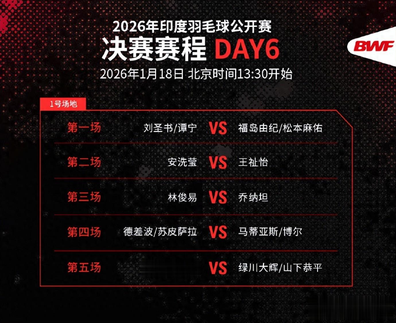 1 月 18 日 13:30,2026 年印度羽毛球公开赛(世界羽联超级 750 赛事)将在新德里英迪拉甘地体育馆展开五场决赛较量,国羽在女单、女双、男双三个单项冲击冠军,混双则遗憾无缘争冠。