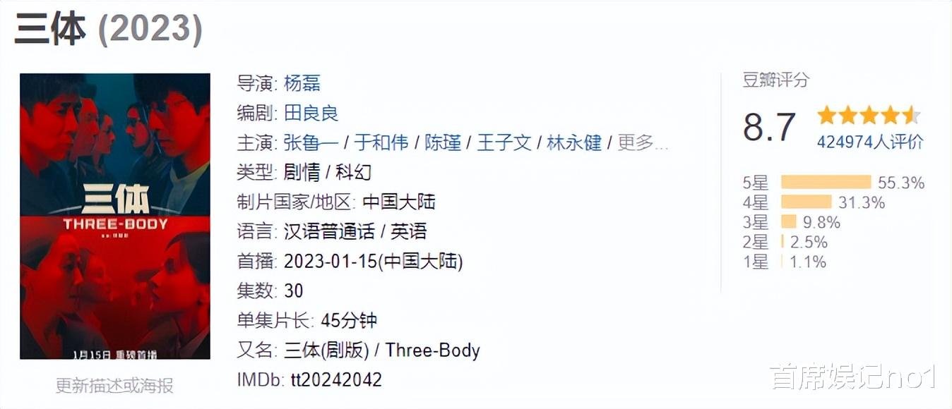基于庞大的读者群体,电视剧《三体》未播先火,众多实力派主演云集,也还算没让粉丝失望。开播后整体呈高开低走态势,部分节奏较缓,是不少观众弃剧的主要原因之一。