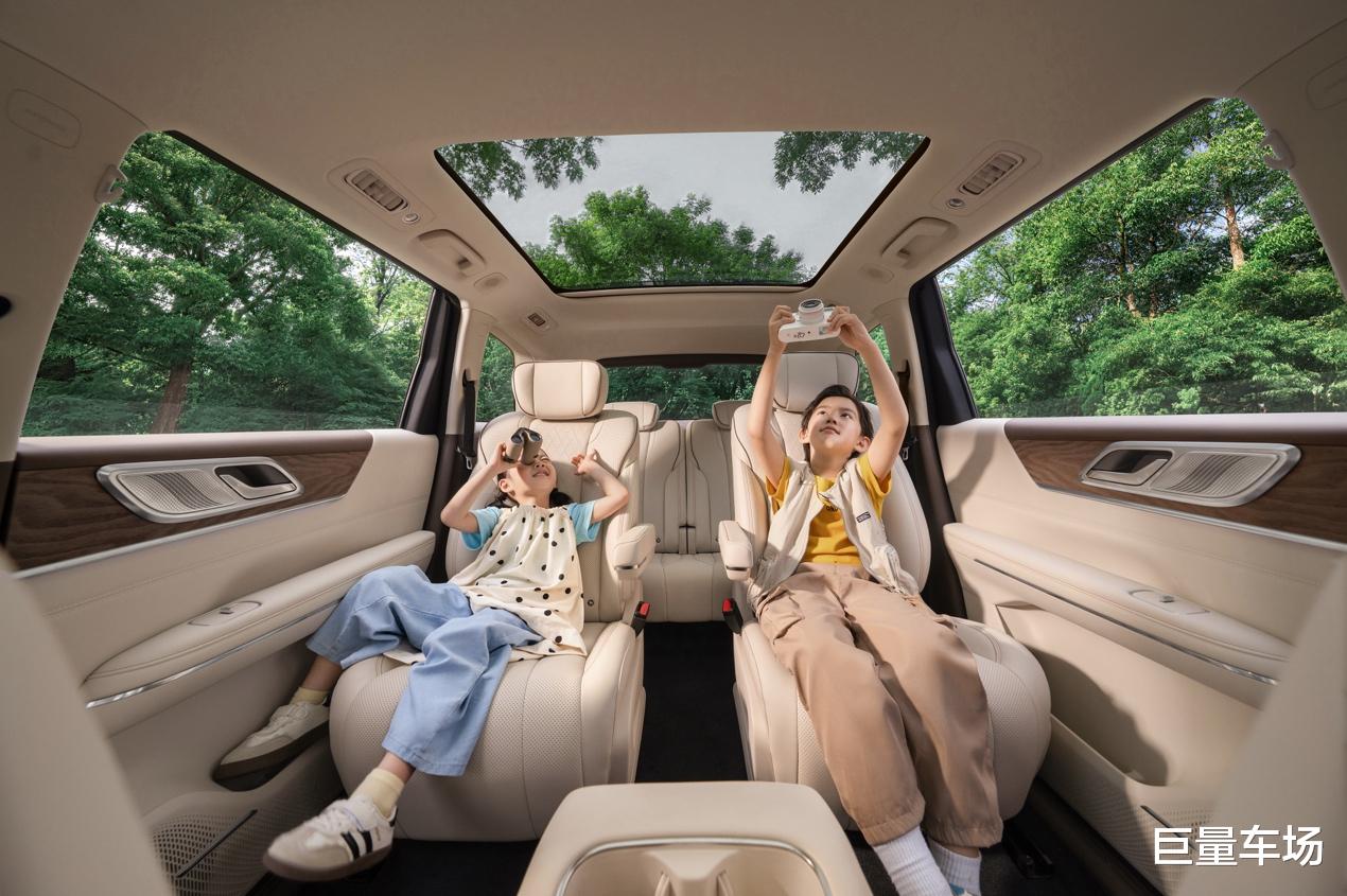 空间方面,新车轴距 2950mm,车内有效面积 5.6㎡,得房率 90%,搭配 1.09㎡天幕与三排舷窗,视野通透。六座布局针对家庭出行优化,1.13m 门洞高度与 0.93㎡门洞面积方便老人、儿童上下车,1.24m 车内层高与 190mm 纯平过道,让二三排进出更便捷,每一排都能获得舒适乘坐体验。车内设有 40 处储物空间,后备箱标准容积 383L,含 101L 隐藏式储物区,拓展后可达 1103L,可轻松收纳婴儿车、行李箱、露营装备等家庭出行物品,搭配隐藏挂钩、中排小桌板、磁吸支架等配置,实用性更强。