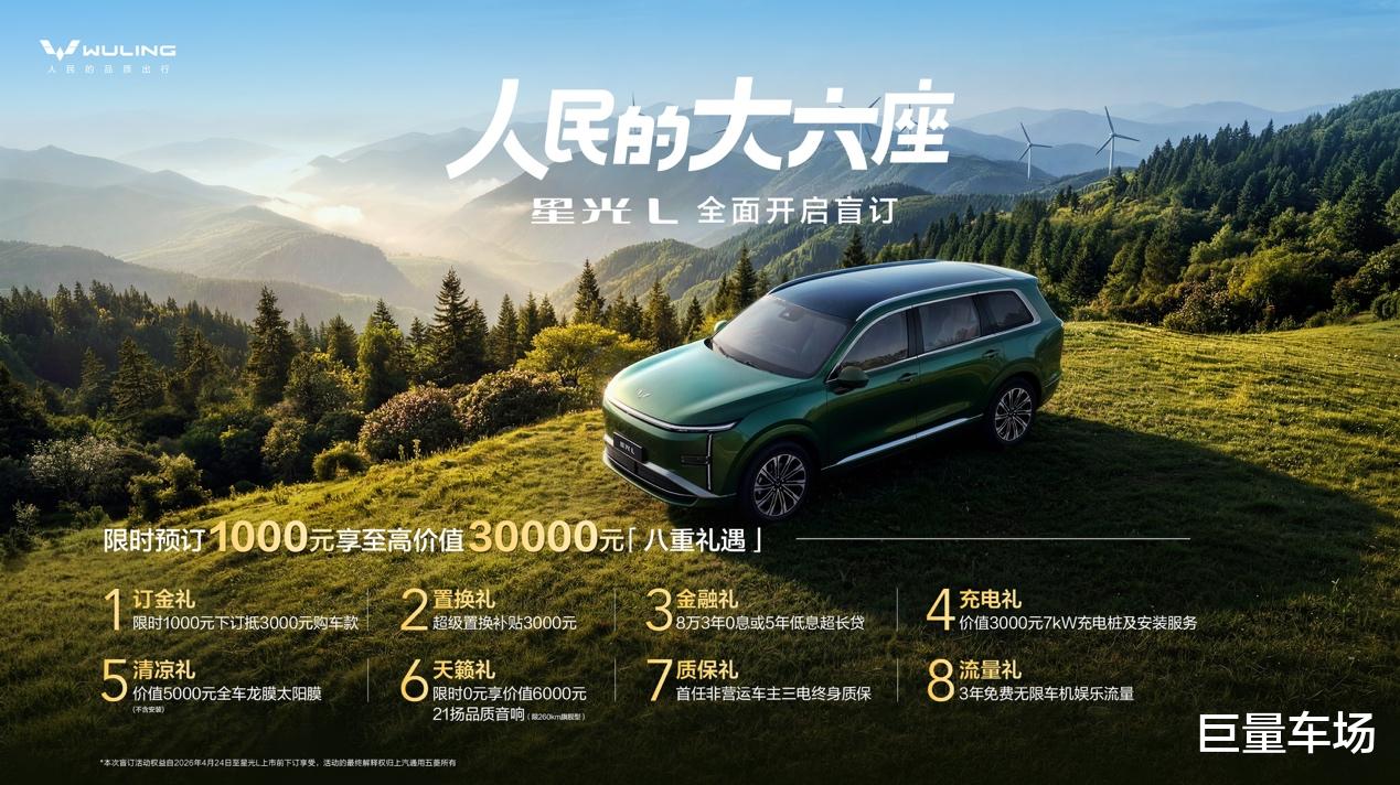 2026 年 4 月 24 日,五菱星光 L 于北京车展正式亮相,这是星光家族首款长续航大六座 SUV,主打家庭出行场景,同步开启盲订,用户支付 1000 元订金,在上市前下订可享受至高价值 30000 元八项购车与用车权益。新车围绕设计、续航、空间、品质打造核心产品力,聚焦多孩家庭与三代同堂出行需求,缓解续航焦虑与空间局促问题,为家庭用户提供更实用、舒适的出行选择。