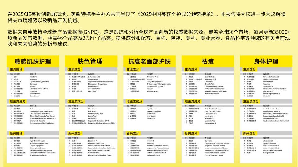 报告由英敏特联合美妆创新展发布,全面梳理了中国美容个护市场的成分趋势,结合全球新产品数据库(GNPD)的最新数据,对未来成分创新路径和市场潜力进行了系统分析。报告显示,敏感肌护理、肤色管理和抗衰老依然是重点赛道,泛醇、依克多因、烟酰胺等明星成分的应用比例持续提升。特别是神经酰胺成分,在配方比例和技术工艺的不断优化下,形成更高效的屏障修护方案,稳居敏感肌修护核心成分之列。