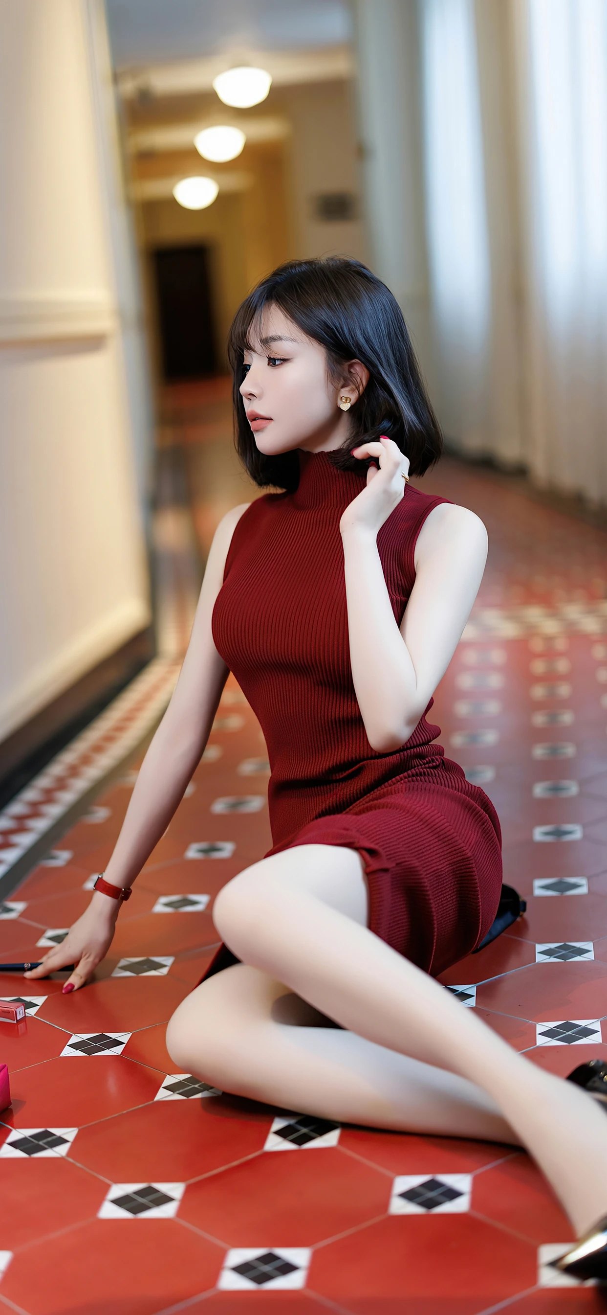 红裙在复古走廊间摇曳,短发利落,手挽黑包,或坐或立,每一个角度,皆是风情万种 。
