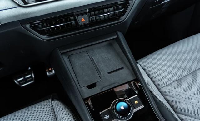 探岳L这款车和途观L PRO是姊妹款,但它们在中央通道的设计上差别挺大。探岳L的副仪表台整体被设计得更低矮,下面的开放式储物格没了。手机放的地方变成了双槽设计,右边有个能通风的无线充电板,左边则是带盖子的数据线插口,插上设备后,多余的线可以整齐地绕在盒子里。