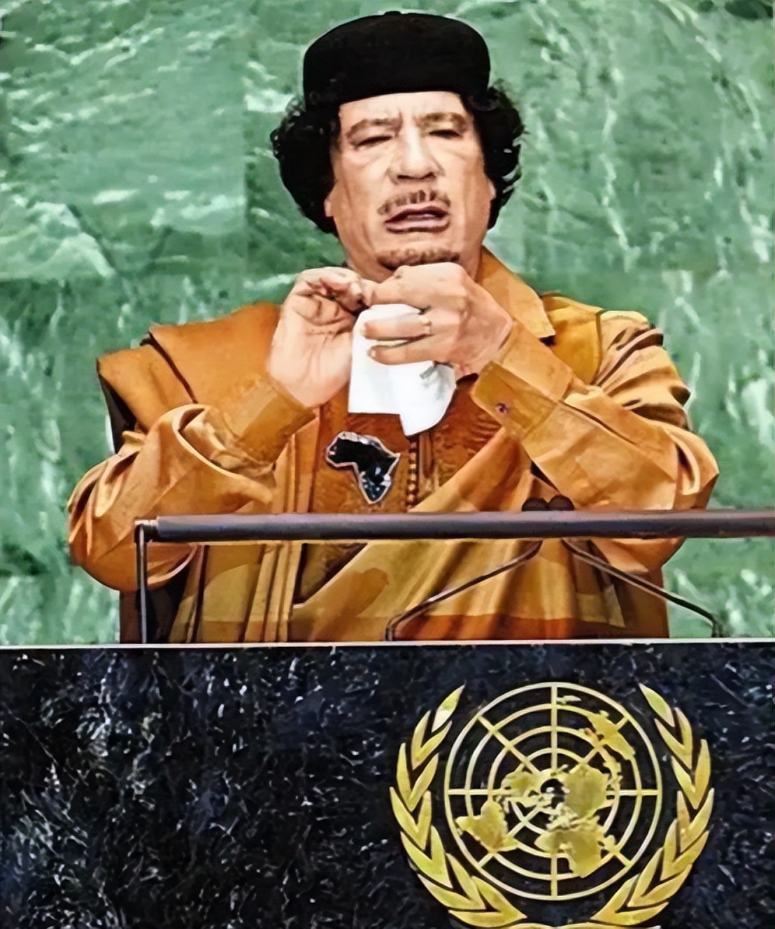 2009年,卡扎菲在联合国滔滔不绝地把五常骂了个遍,还当众撕毁联合国宪章,一边撕一边又不忘对自己的“第八大奇迹”歌功颂德,总之那时候的卡扎菲眼里哪有什么大国、强国,全世界最牛的只有他一个人了。