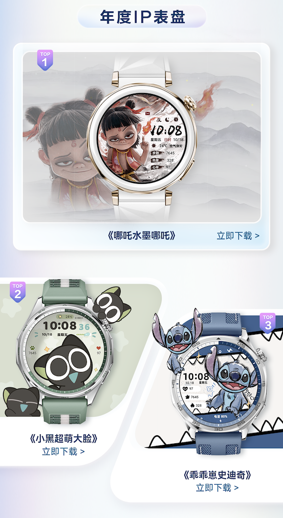 还有表盘榜单,同样亮点满满。“年度人气表盘”里,《运动功能数字》科技感拉满,《王牌飞行员》则质感细腻。“年度IP表盘”更是经典出击——水墨哪吒侠气十足,小黑猫大脸萌度超标,搭配同系列手机主题,一整个“穿戴氛围组”直接到位!用华为手表的同学,是时候给手腕也换个皮肤了~