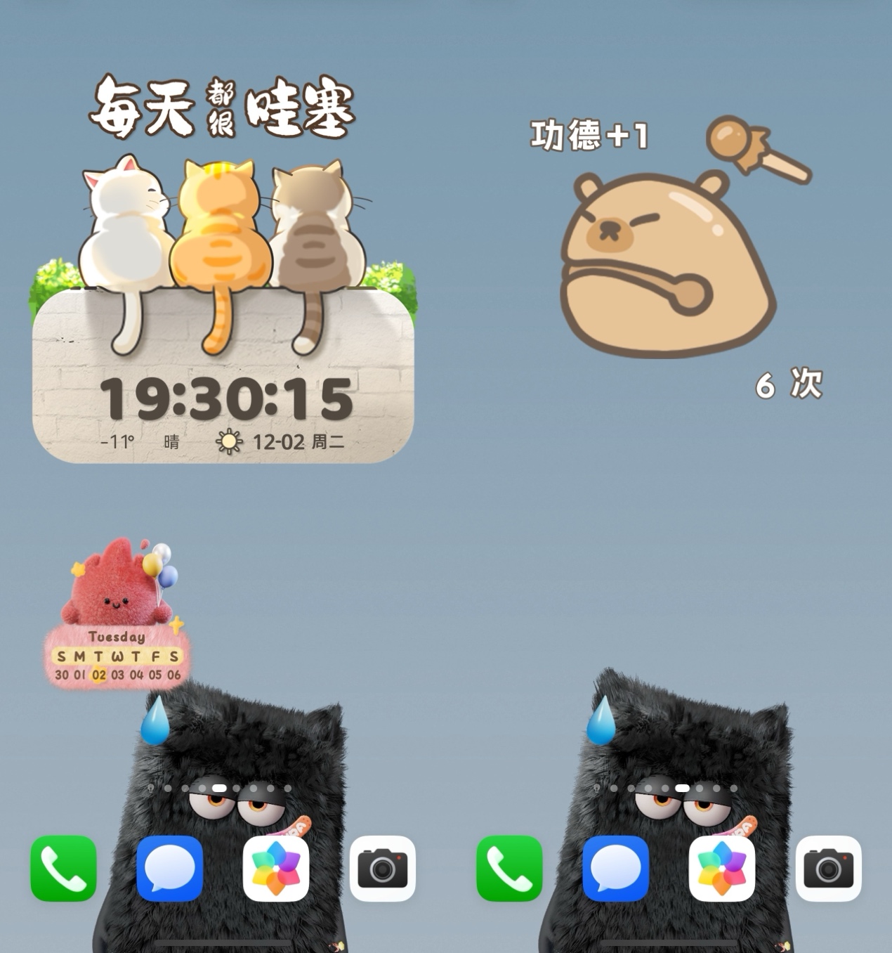 除了大家熟知的各种主题外,华为主题还推出了个“百变卡片”功能,让大家可以更好的DIY桌面。比如动态喵趣时钟,三只小猫在你的桌面上排成一排摇尾巴,桌面瞬间就变得可爱起来;“Fire可爱毛毡日历”则是将小火苗毛绒化,再与日历功能进行融合,颜值直接戳心巴。有的卡片则是以趣味性取胜,比如卡皮巴拉小木鱼,这个水豚小木鱼不仅长得好玩,还会跟我们互动:手指敲一下就会显示“功德+1”,开会摸鱼的时候玩两下非常解压。