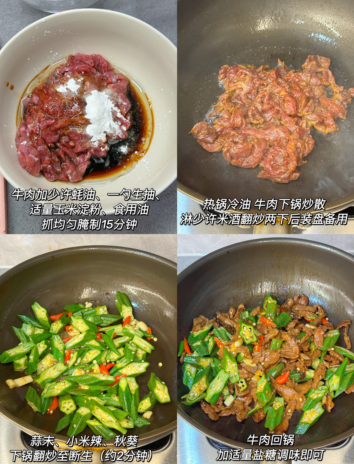 锅中留底油,蒜末与小米辣同时下锅。蒜香与辣味在热油中交织,像是一对默契的舞伴。切好的秋葵倒入锅中,翠绿与洁白在翻炒中跳跃。秋葵受热后,那种特有的会慢慢渗出,这是它的灵魂所在——有人嫌它滑腻,我却觉得这是秋葵最温柔的表达。大约两分钟,秋葵的颜色变得更加鲜亮,边缘微微起皱,此时正是牛肉回锅的最佳时机。先前炒好的牛肉片重新倒入锅中,与秋葵相遇,像是久别重逢的老友,在高温中叙说着各自的经历。