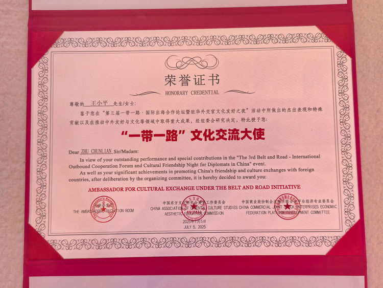 2025年 7 月 5日,由中国商业股份制企业联合会平台经济专业委员会主办的第三届“一带一路·国际出海合作论坛暨驻华外交官文化友好之夜”活动在北京举行。世界和平友好使者王小平、北京爱和美国际文化交流有限公司总经理冯子收等代表荣获组委会授予的 “一带一路” 文化交流大使称号。