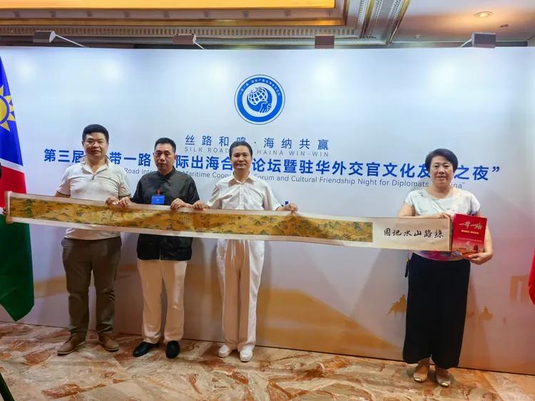 世界和平友好使者王小平向公使献礼一带一路文创艺术品《丝路山水地图》