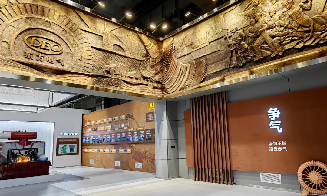 争气馆展厅两侧主题浮雕以东汽经典创新故事为原型进行创作,展示出坚韧不拔的东汽精神,是支撑科技创新的不竭动力。