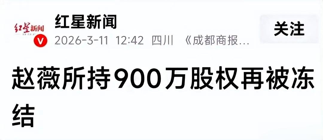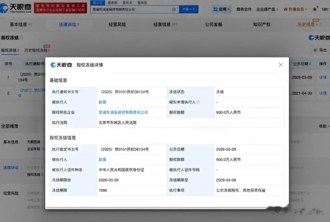 赵薇持有的芜湖某公司900万股权,再次被冻结三年。
