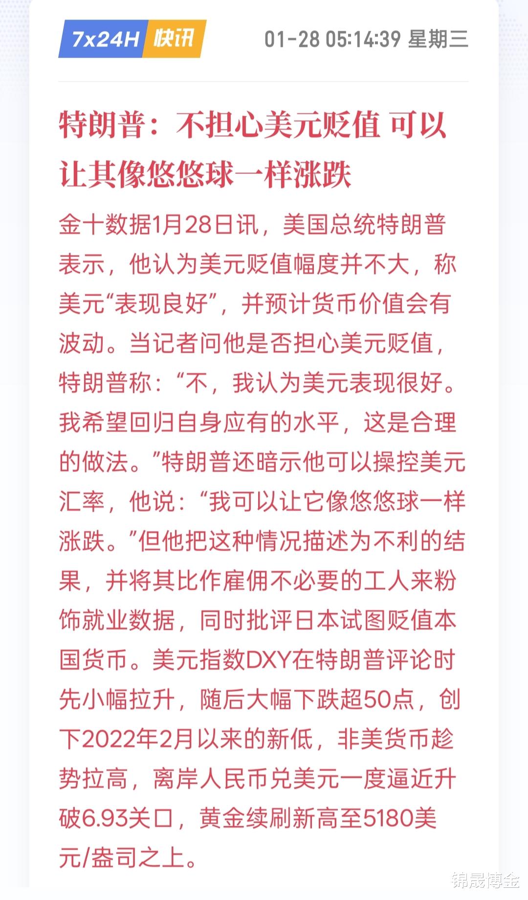 那么凌晨到今天的这个强势上升,主要还是受到川普言论的影响,他表示不担心美元贬值,可以让其像溜溜球一样涨跌。此话一出,美指瞬间跳水,你看下美元指数跌到了自2022年以来的低点。