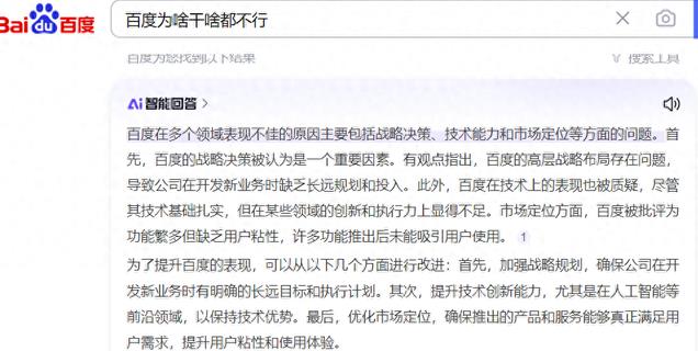 在百度上搜索"为啥百度干啥啥不行",结果百度Ai给了个答案: