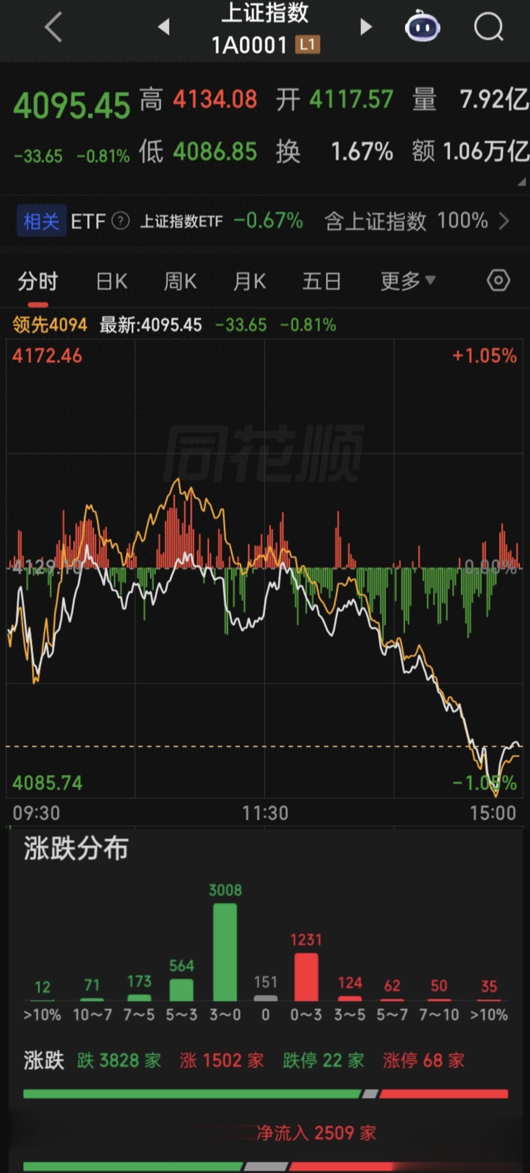 上证收4095.45,跌0.81%,成交1.06万亿,深证成交1.34万亿,创指成交5799亿,共成交24173亿,比上个交易日缩量433亿,上涨1502家,下跌3828家,涨停68家,跌停22家