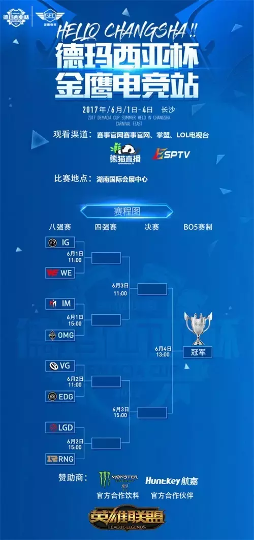 在经过德杯金鹰站预选赛阶段六个比赛日的层层淘汰之后,最终由IG、IM、VG、LGD四支队伍脱颖而出,成功跻身八强。根据德杯赛程安排,八强战中,这四支队伍将分别面对2017LPL春季赛四强队伍WE、OMG、EDG、RNG。其中IG将在八强对抗的首场比赛中挑战LPL春季赛冠军WE。