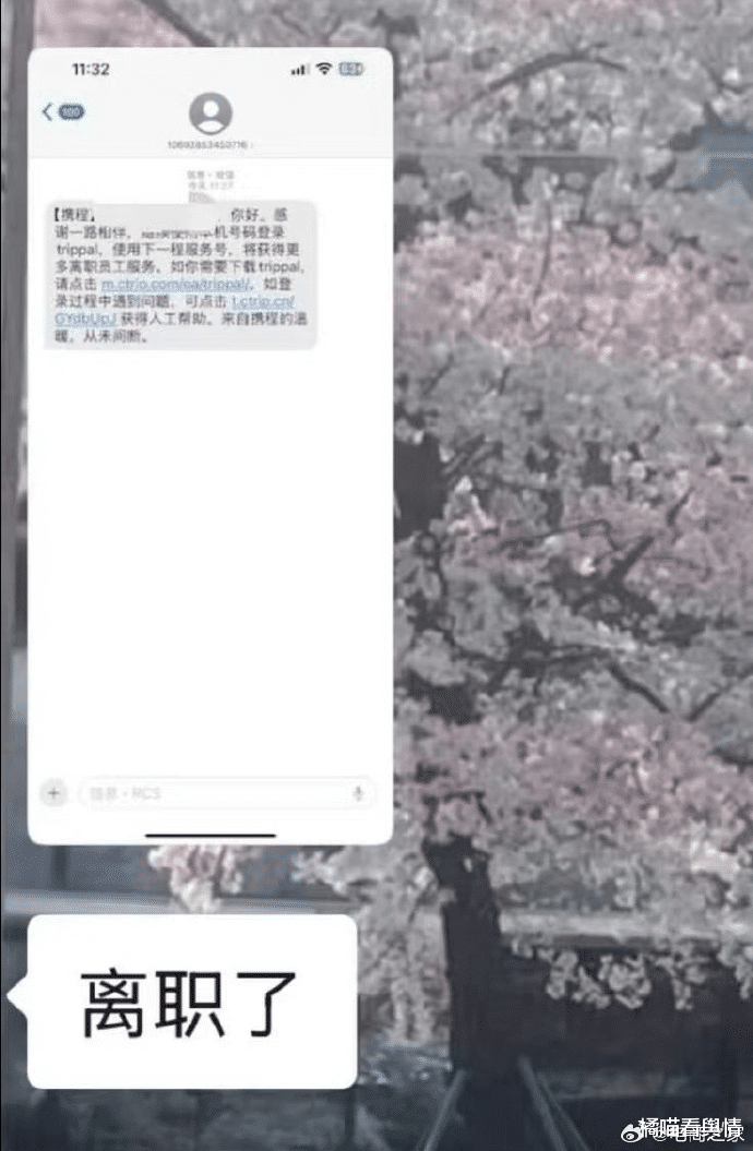 离职短信内容:“XX你好,感谢一路相伴,继续使用本机号码登录Trippal,使用下一程服务号,将获得更多离职员工服务”。