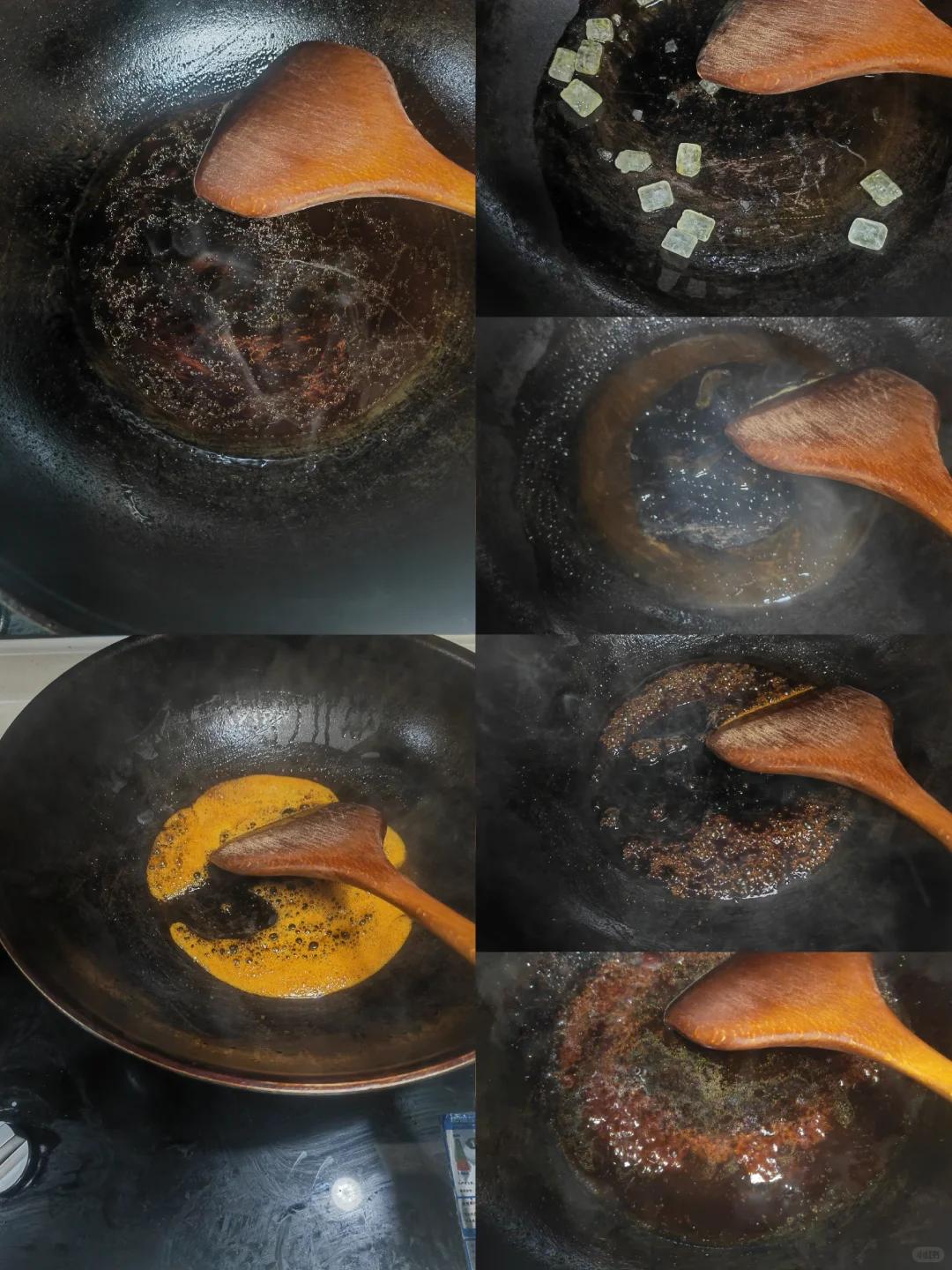 热锅凉油,就把糖放下去,用小火慢慢炒,看到它融化变成琥珀色,再下其他食材翻炒,这样糖的焦香才能紧紧包裹住食材,颜色也红亮诱人。