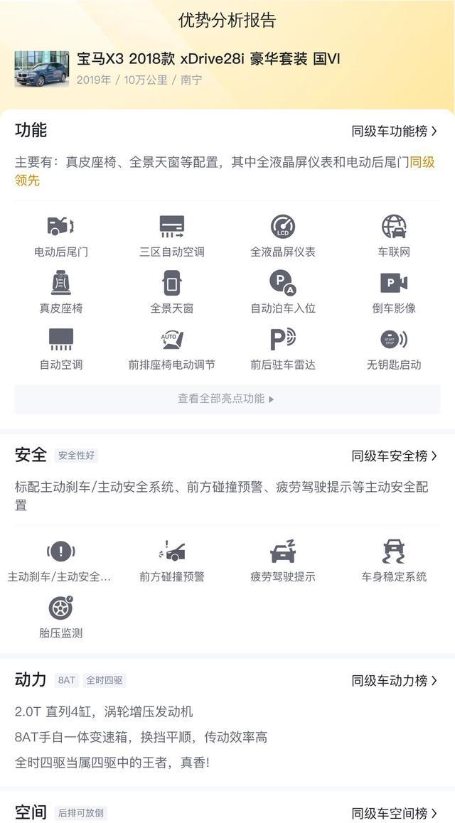 现在,让我们关注一款具体的车型:2018款宝马X3 xDrive28i 豪华套装。笔者所关注的这款车于2019年上牌,行驶了10万公里,如今的价格仅为17.38万元。与其原价42.58万元相比,折扣相当诱人。在如今激烈的二手车市场竞争中,这样的价格无疑吸引了大量消费者。面对如此低廉的价格,许多人会在心中盘算:这个车到底值不值得买?