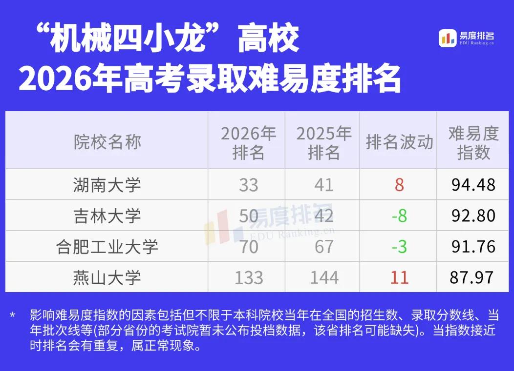 2026年高考录取难易度排名呈现出鲜明的分化态势:湖南大学以33名的位次逆势上升8名,稳居四校之首;吉林大学位次滑落8名至50位,热度有所降温;合肥工业大学微降3名至70位,依旧是中分段热门;燕山大学则凭借11名的跃升跻身133 名。