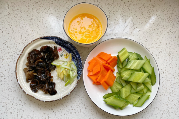 1、先把一会要用到的食材都准备好了,干木耳提前用温水浸泡,泡发了以后要清洗干净。黄瓜还有胡萝卜清洗干净了以后,切成片状不用太薄也不用太厚。葱花,生姜切成丝,鸡蛋打进小碗里面,加入少量的盐打散。