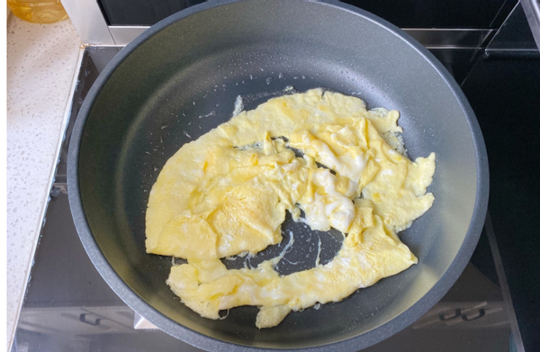 2、平底锅里面加入适量的食用油,烧热后倒入打散了的鸡蛋,快速翻炒至结块了以后盛出来备用,不用把鸡蛋炒得太熟了,就结块就好了。