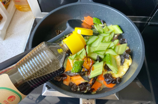 胡萝卜半根,木耳5克,黄瓜1根,鸡蛋2个,原汁酱油1勺,大葱少量,生姜2片,清水50克,盐1勺,植物油3勺。