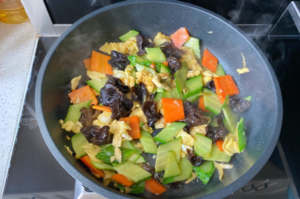 7、色香味俱全的胡萝卜木耳炒鸡蛋就做好了。一道非常简单的家庭小炒,但是用到的食材还是比较全面的,胡萝卜,黄瓜,木耳,都还是营养丰富的食材。