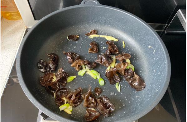 4、再将木耳也放进去翻拌一下,翻炒均匀。再将胡萝卜片放进去,翻炒变软。可以加上一点点的清水,更加方便胡萝卜入味。