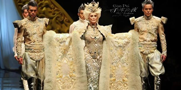 据说这礼服重达百斤,身侧还有两位随行的“随从”,仿佛是皇后出行的阵仗,霸气之姿尽显。