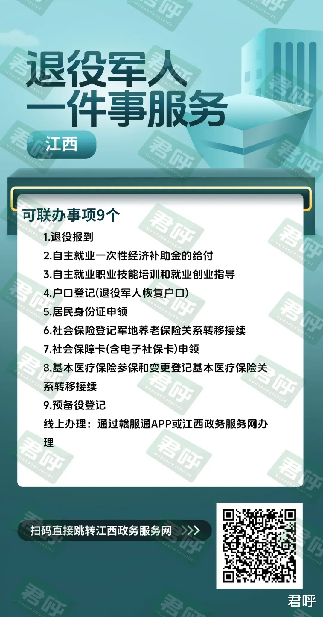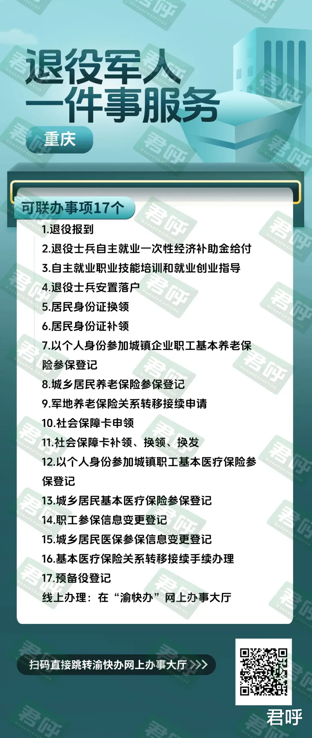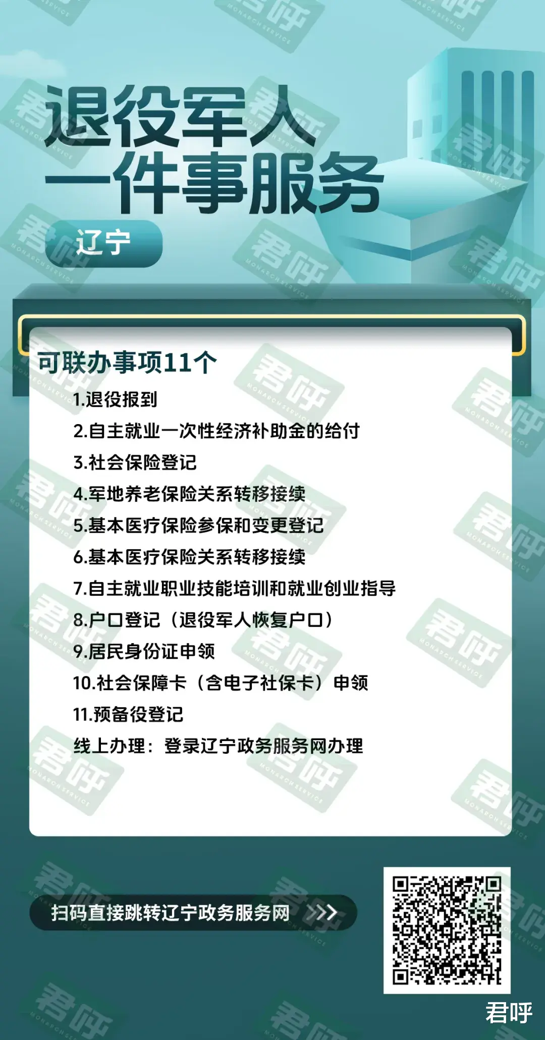 “君呼”深入调研四川、江苏、上海、重庆、海南等二十余个省(市、区)政策,为大家全面梳理归纳了各地“退役军人一件事”服务清单。无论是退役报到、经济补助申领,还是社保医保接续、身份证办理、就业培训指导……这些关键事项都可在线上平台一键通办,服务贴心又实在。