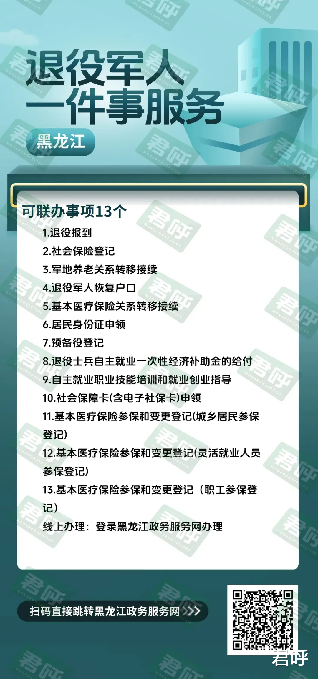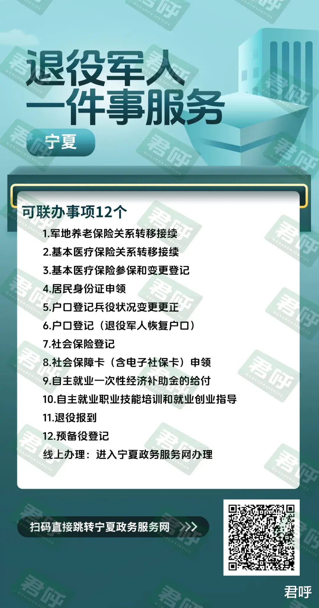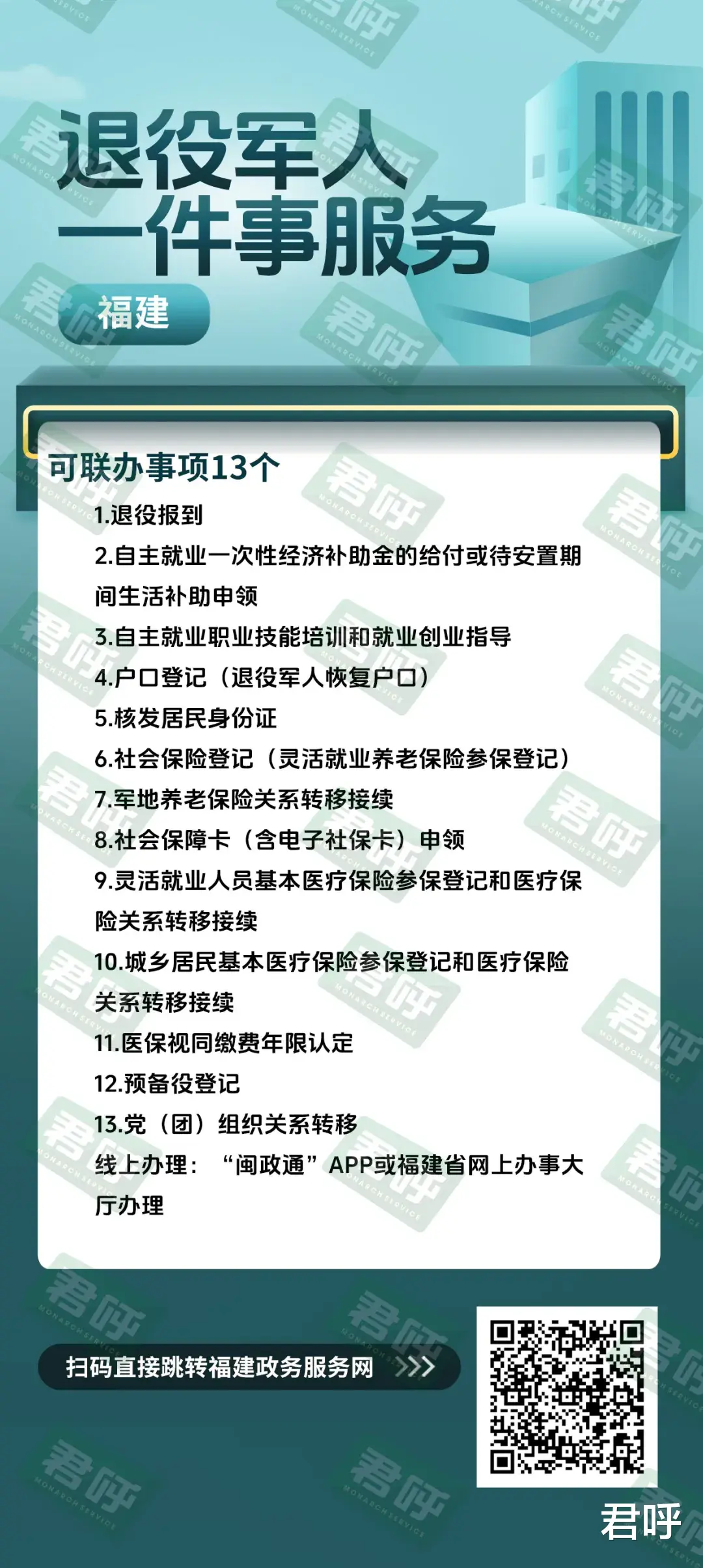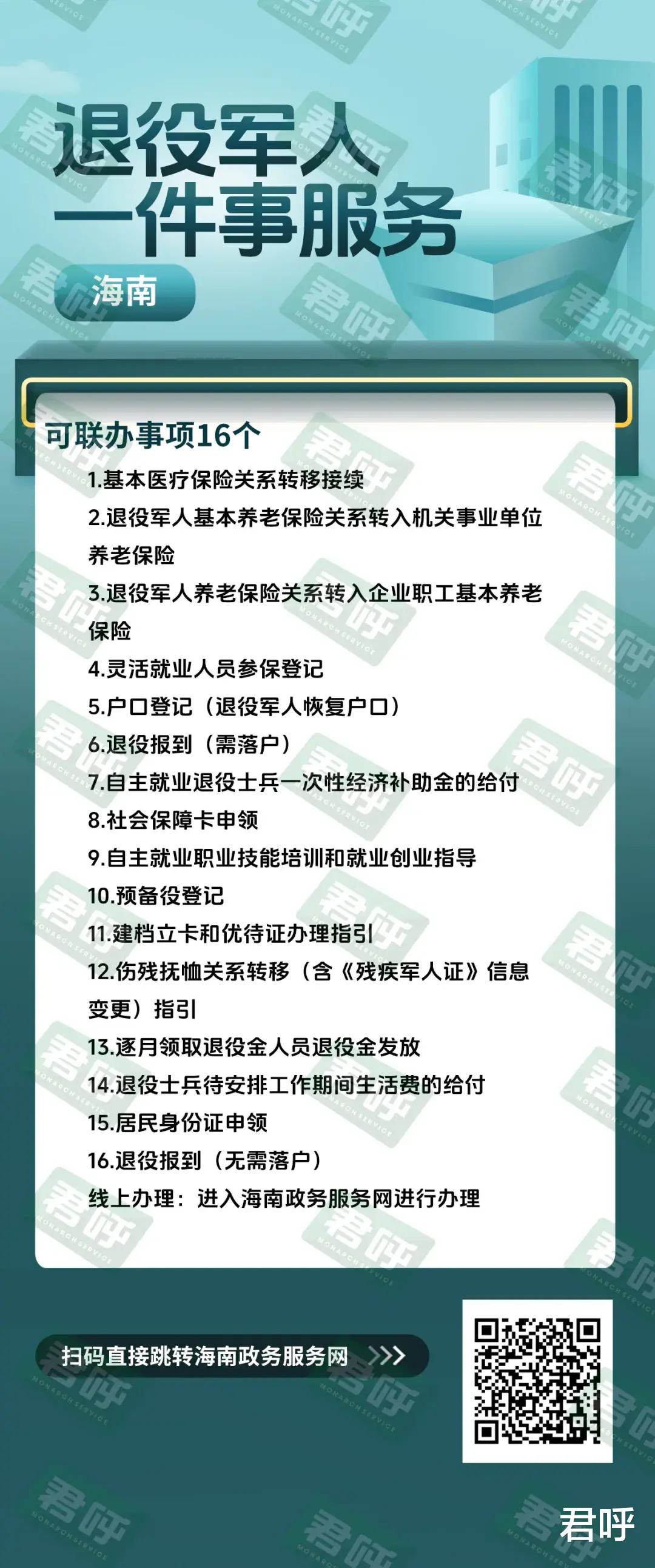 “君呼”深入调研四川、江苏、上海、重庆、海南等二十余个省(市、区)政策,为大家全面梳理归纳了各地“退役军人一件事”服务清单。无论是退役报到、经济补助申领,还是社保医保接续、身份证办理、就业培训指导……这些关键事项都可在线上平台一键通办,服务贴心又实在。