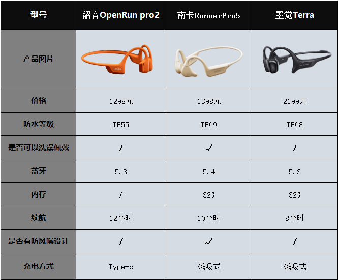 值得注意的是,韶音OpenRun Pro2采用了Type-C接口充电,虽缓解了用户专线专用的困扰,但要求用户更注意充电口的防护,尤其是防尘盖老化问题,这可能影响耳机的使用寿命。相比之下,南卡RunnerPro5与墨觉Terra均采用了磁吸充电方式,不仅方便快捷,还能有效降低耳机进水风险,为使用提供了更多便利。