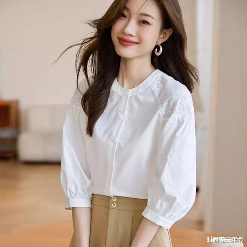 如果再选择有这种刺绣拼接工艺等细节的款式,就更加有时尚魅力了。这件衬衫在插肩袖上做了巧妙的拼接,增添了细节的看点,袖口处的灯笼袖设计更加爽利。这种七分袖衬衫既有长袖的优雅,又不失短袖的干练,让你一旦穿上都舍不得换下。