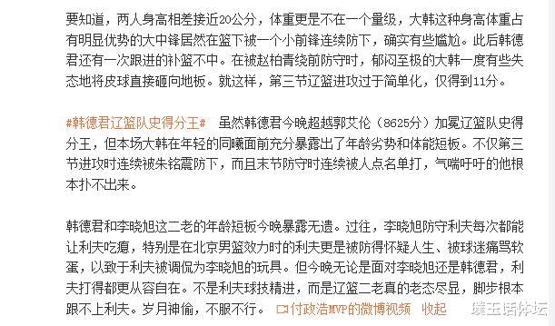 此外知名媒体人付政浩对大韩进行点评并认为老态尽显。他发文表示韩德君和李晓旭这二老的年龄短板暴露无遗。李晓旭防守利夫每次都能让利夫吃瘪,特别是在北京男篮效力时的利夫更是被防得怀疑人生、被球迷痛骂软蛋,以致于利夫被调侃为李晓旭的玩具。但今晚无论是面对李晓旭还是韩德君,利夫打得都更从容自在。不是利夫球技精进,而是辽篮二老真的老态尽显,脚步根本跟不上利夫。岁月神偷,不服不行。