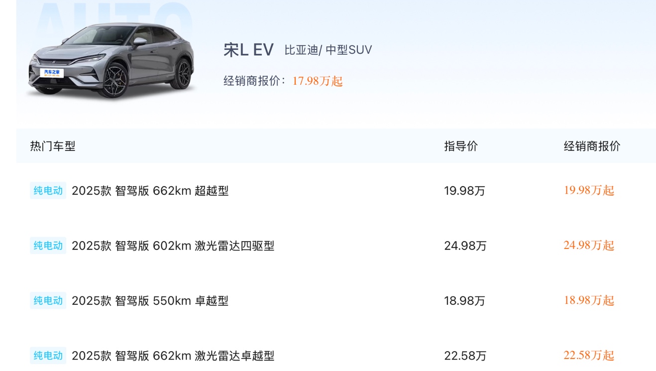 面向中高端车型的天神之眼B方案,搭载1或2颗激光雷达和Orin-X芯片。以2月份上市的宋L EV智驾版为例,售价区间为17.98万元-24.98万元。其中,搭载天神之眼B方案的是22万元以上的两个配置。其他均搭载的天神之眼C方案。