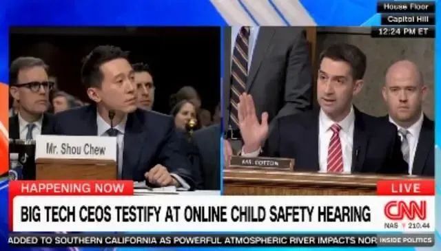 知名反华议员汤姆·科顿(Tom Cotton),面对出席作证的TikTok CEO周受资,一连抛出8个问题,反复询问其护照所在地、国籍。