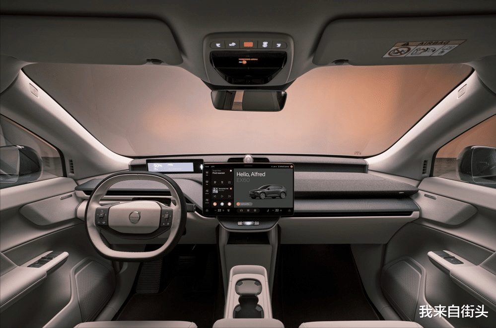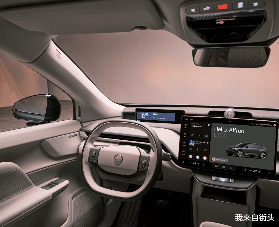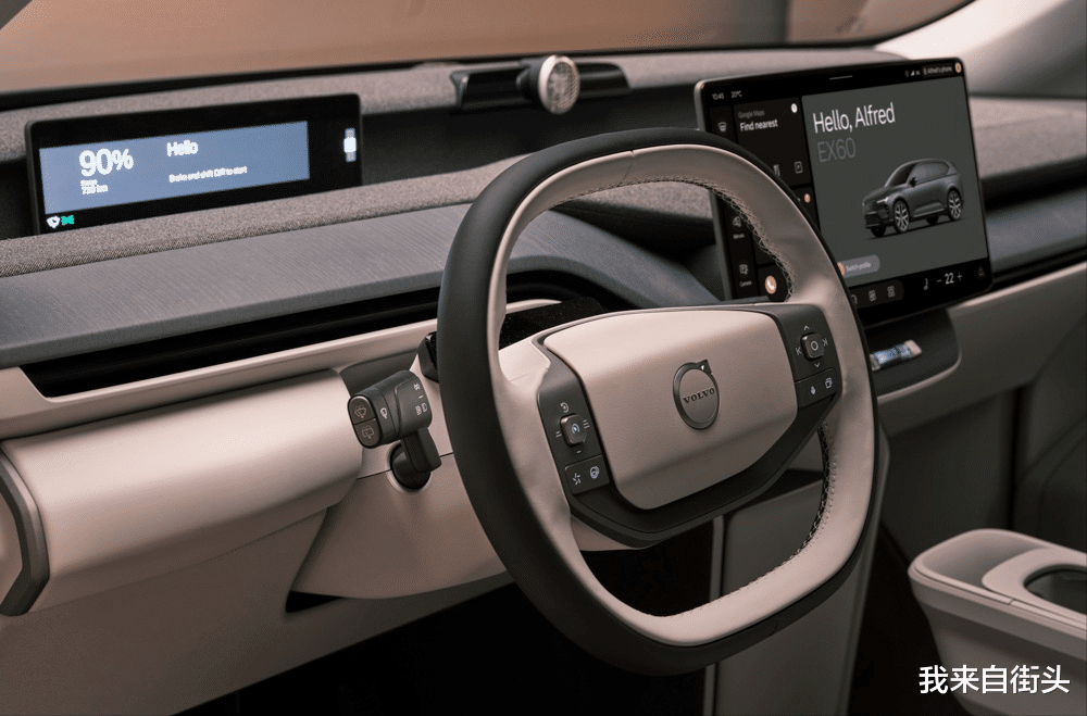车内是沃尔沃一贯的北欧风格设计,双辐式方向盘、数位化仪表板和横向的中控屏幕,冷气出风口则隐藏在中控台上的设计线条里。仔细一看,沃尔沃EX60取消了许多实体按键,排挡杆改为怀挡设计,而中控屏幕下方也只有两颗按键。