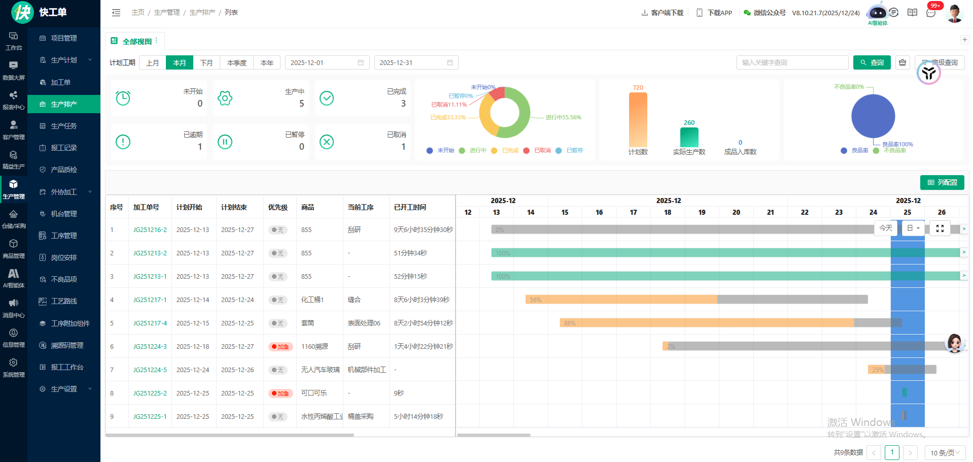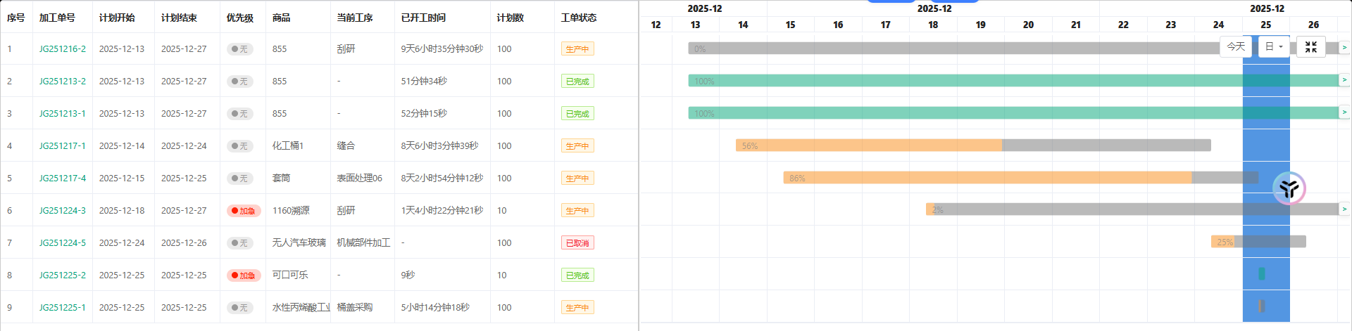 更绝的是 **“全局 + 细节” 双视角 **:上方的环形图直接给出生产占比(进行中 53.56%、已完成 13.33%),柱状图同步显示计划数、实际生产数;下方的甘特图则把每个工单的时间轴拉满 —— 加急工单标红提醒,已完成工单用绿色进度条 “打勾”,逾期工单自动亮灯。比如 1160 渊源的加急工单,12.18 开工后进度实时更新,不用再担心紧急单被 “埋” 在任务堆里。
